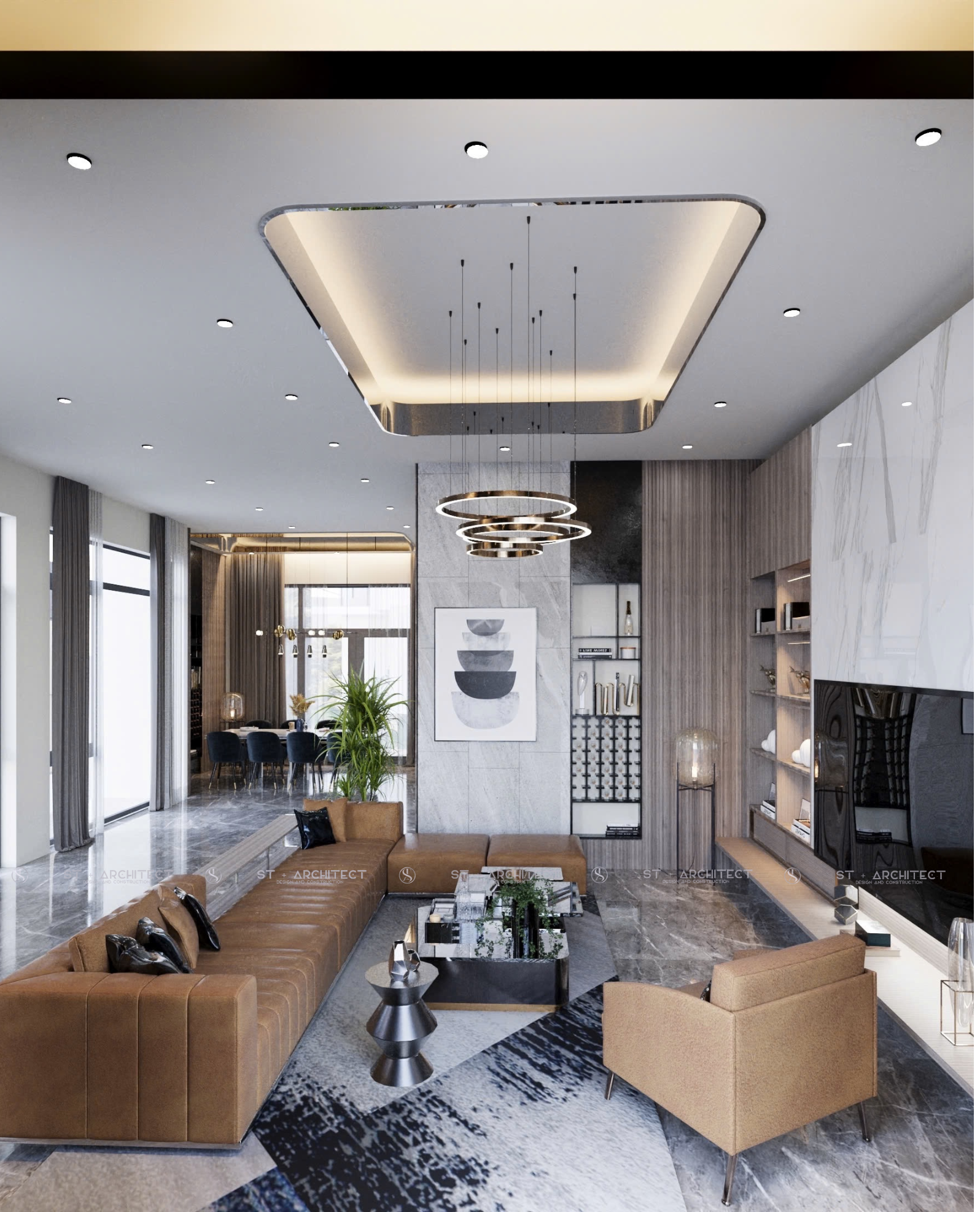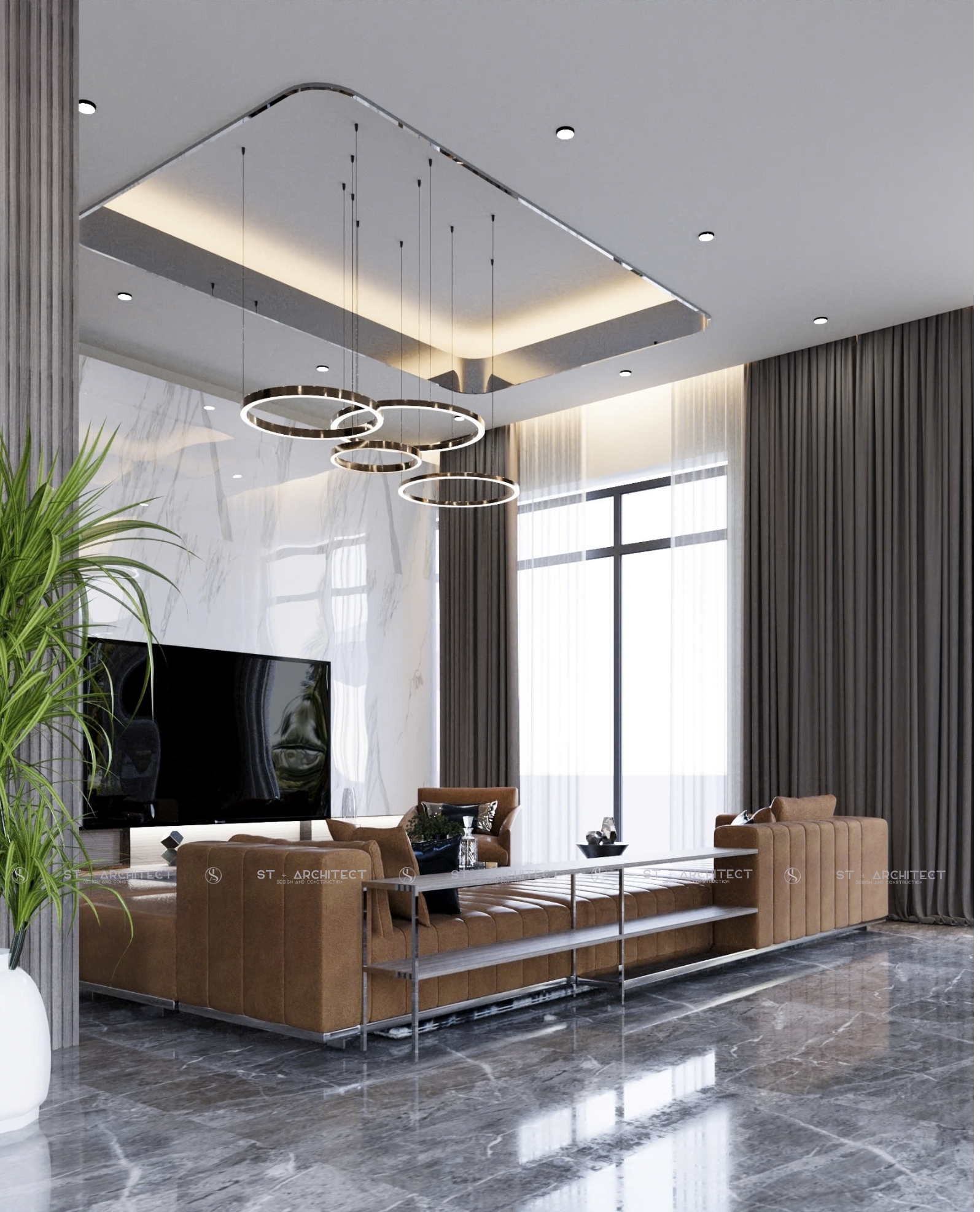 Phòng khách nổi bật với bộ sofa da nâu cao cấp, kết hợp cùng sàn đá marble bóng loáng và hệ trần giật cấp tinh tế. Màu sắc trung tính phối cùng ánh sáng dịu nhẹ từ đèn trần vòng tròn tạo nên không gian ấm cúng nhưng vẫn hiện đại. Bức tường ốp đá vân mây cùng kệ tivi tối giản càng tôn lên vẻ thanh lịch cho không gian tiếp khách.