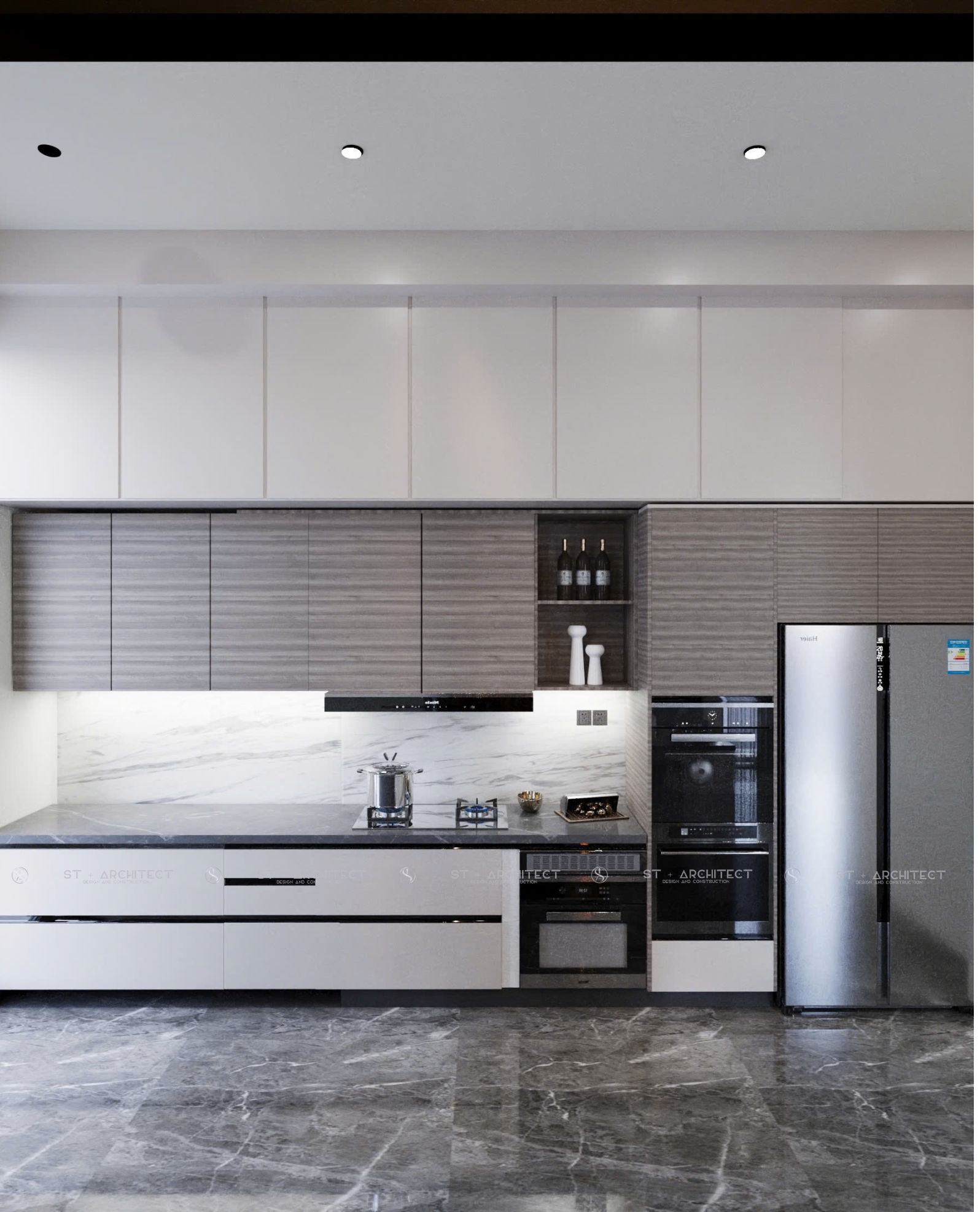 Khu vực bếp sử dụng tông màu xám – trắng thanh lịch, cùng hệ tủ phẳng tối giản giúp tối ưu không gian lưu trữ. Mặt bếp và đảo trung tâm được ốp đá marble cao cấp, kết hợp cùng thiết bị bếp hiện đại mang lại sự tiện lợi và tinh tế cho người nội trợ.