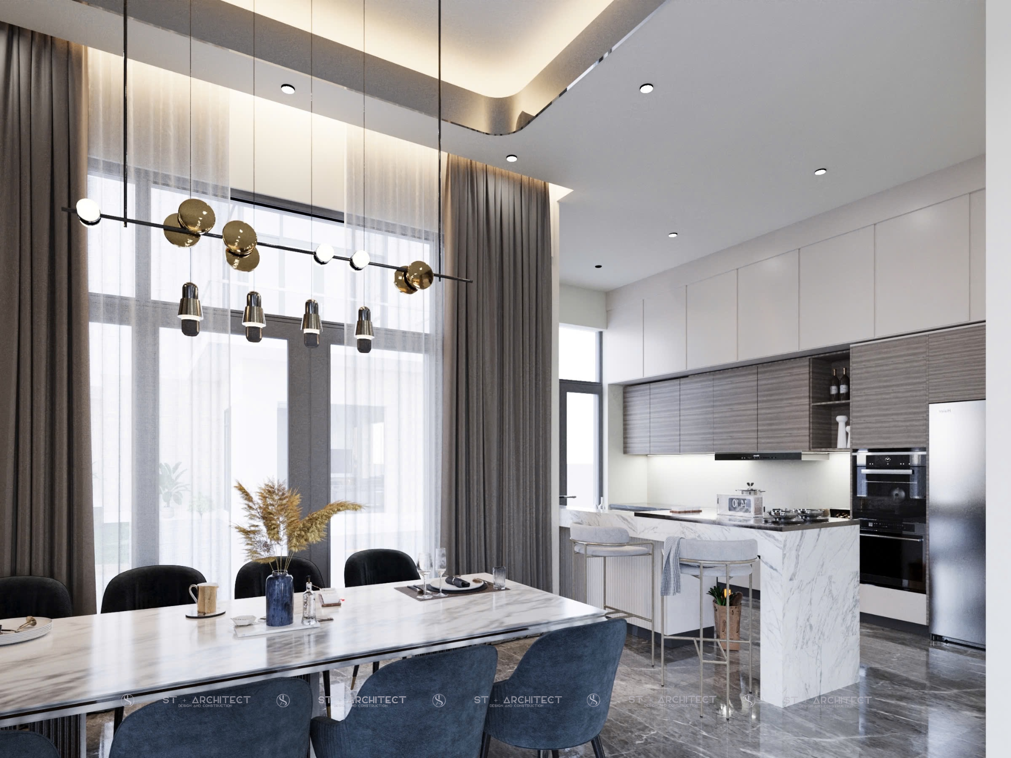 Liền kề với phòng khách là khu vực bàn ăn – được thiết kế theo phong cách tối giản, sử dụng bàn đá vân mây và ghế nhung đen sang trọng. Hệ đèn thả kim loại ánh vàng mang lại cảm giác ấm cúng, gần gũi nhưng vẫn đầy nét thời thượng. Không gian mở giữa phòng ăn và bếp tạo sự kết nối mạch lạc, giúp sinh hoạt gia đình thêm thuận tiện.