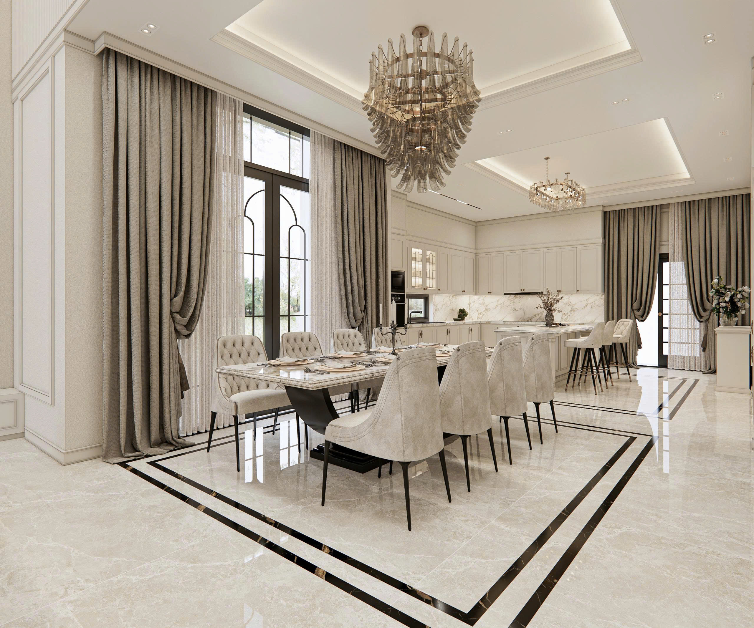 Khu vực bàn ăn được bố trí theo hướng liền mạch với phòng khách, tạo nên dòng chảy không gian hợp lý.