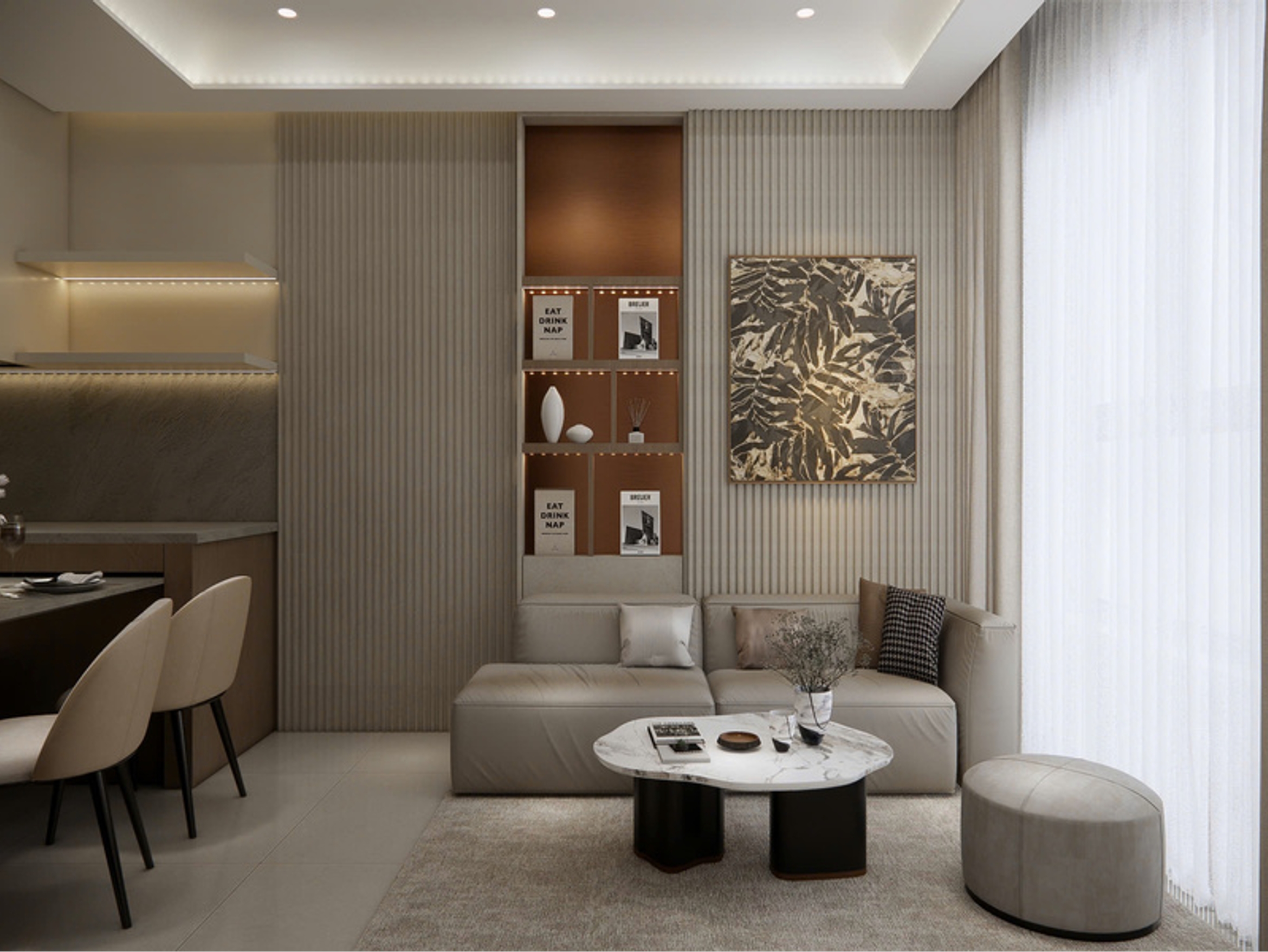 Hệ tủ âm tường & kệ trang trí tích hợp giúp không gian gọn gàng, không bị chia cắt thị giác