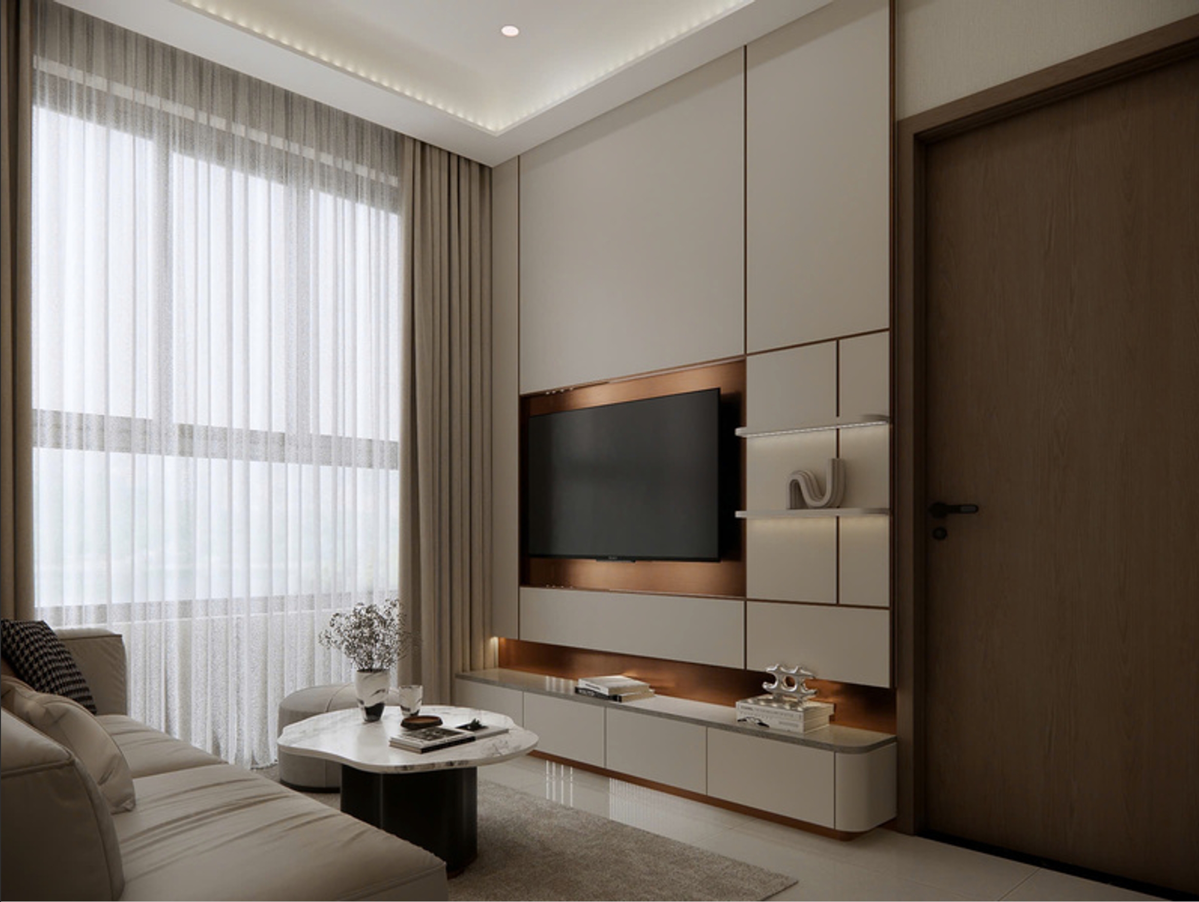 Gam màu trung tính (trắng – be – gỗ sáng) làm nền, giúp ánh sáng phản xạ tốt, tăng độ thoáng