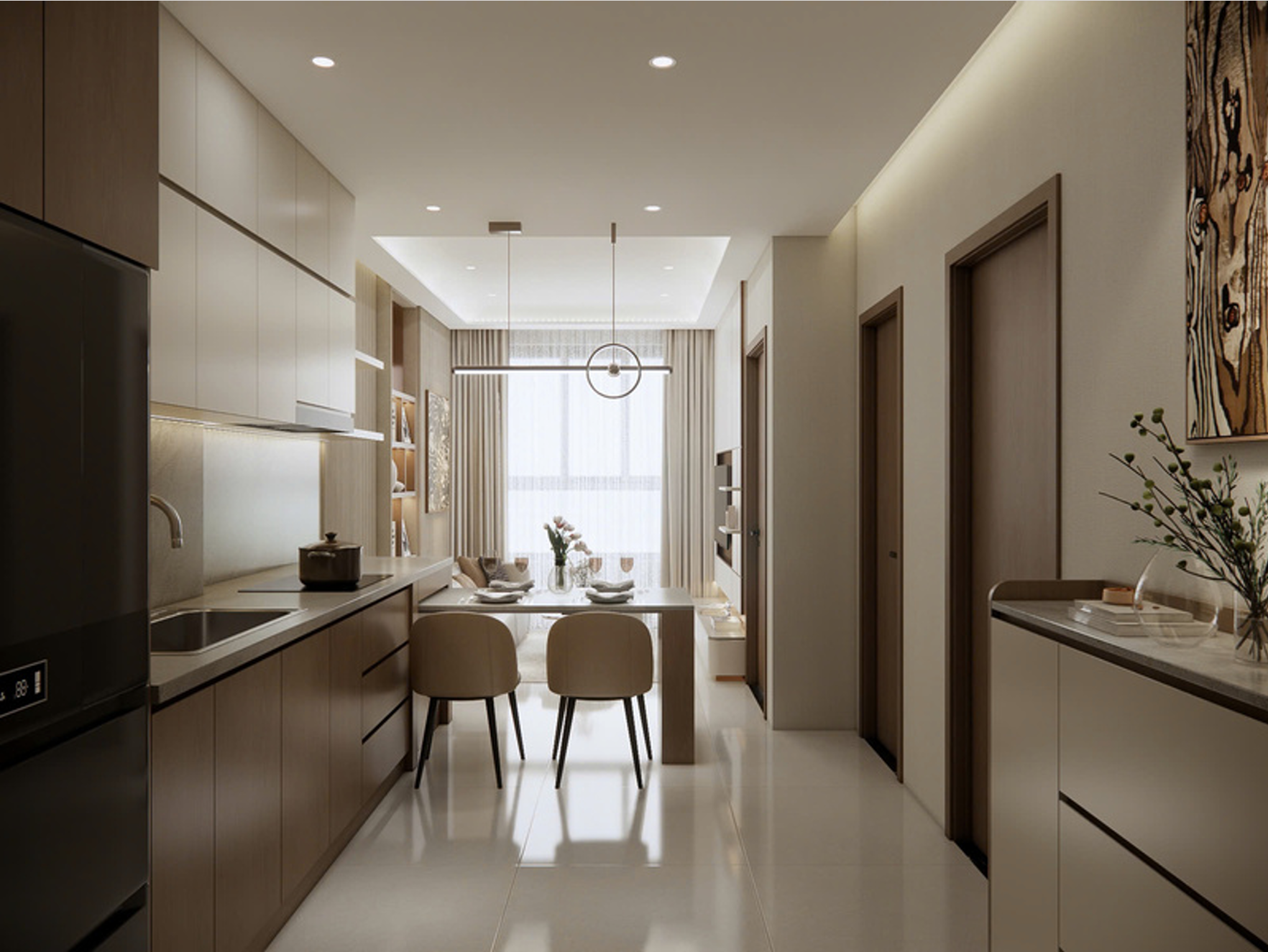Không gian phòng khách – bếp được tổ chức theo trục dọc xuyên suốt, tạo cảm giác căn hộ rộng hơn diện tích thực.