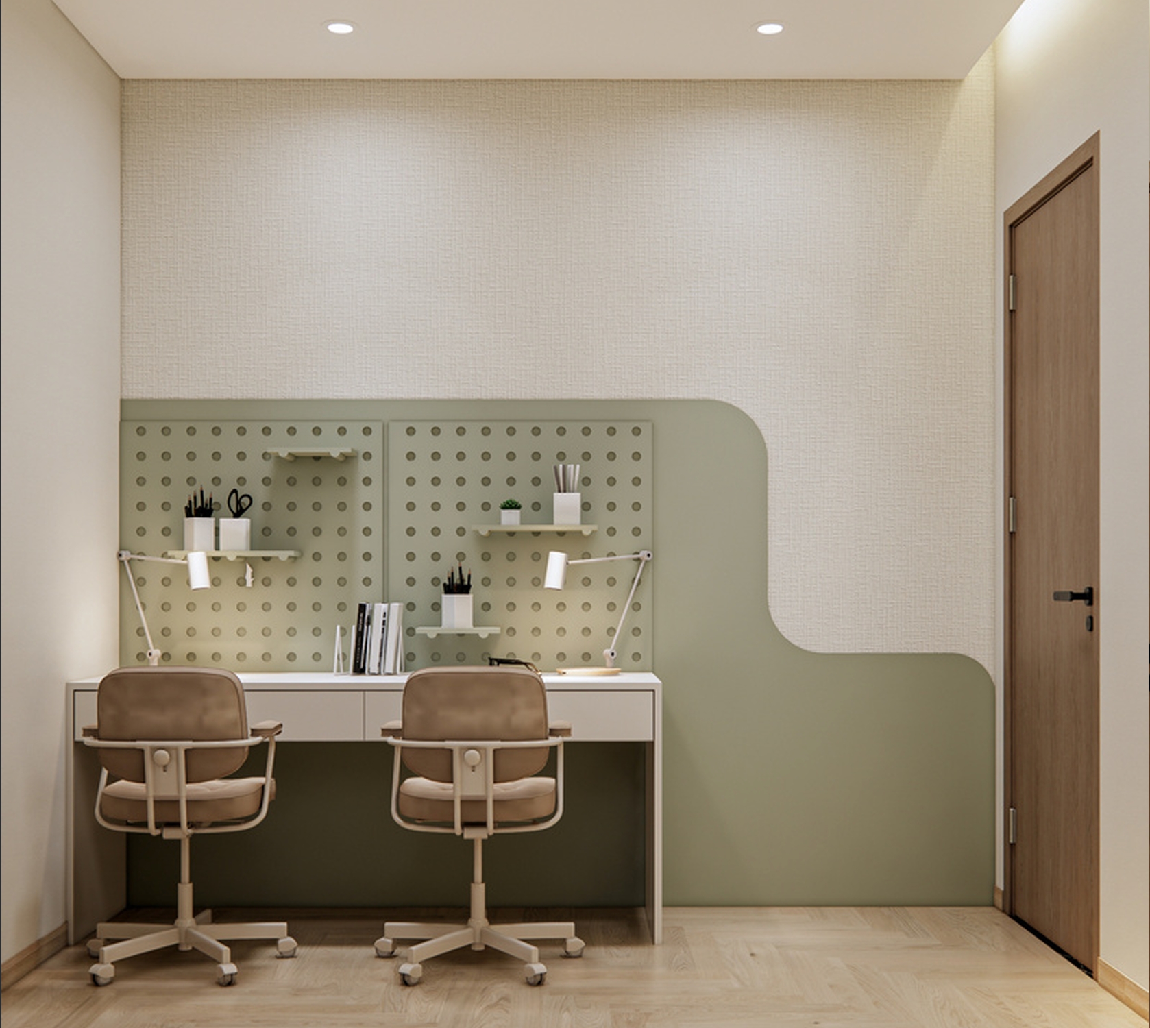 Thiết kế bo góc, màu sắc dịu nhẹ (xanh pastel – gỗ sáng) đảm bảo an toàn và cảm xúc tích cực cho trẻ