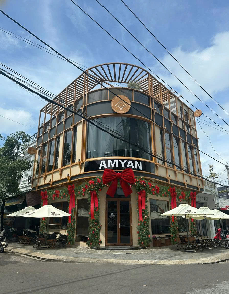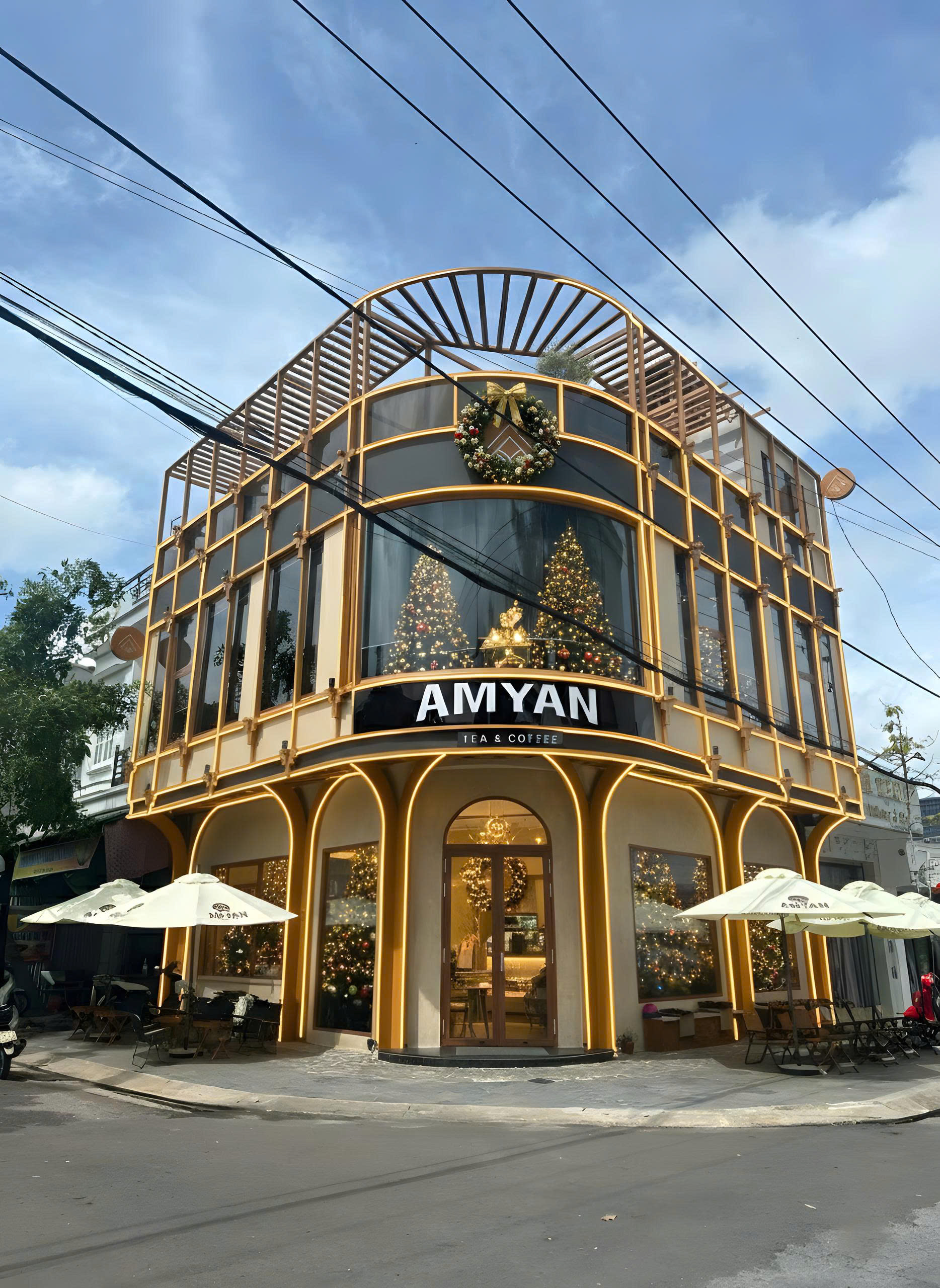 Tọa lạc tại vị trí đắc địa, Amyan Tea & Coffee nổi bật với thiết kế hai tầng sử dụng hệ khung kim loại ánh vàng đặc trưng. Ban đêm, công trình trở thành “ngọn hải đăng” của cả khu phố, thu hút mọi ánh nhìn bởi:
