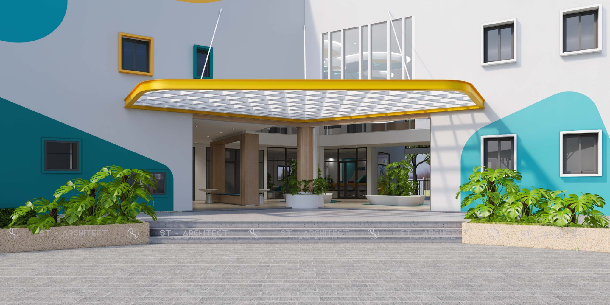 ✨ Thiết kế hiện đại – màu sắc sinh động: Mặt đứng với các khối hình học và gam màu tươi sáng (vàng – xanh – trắng) tạo cảm giác vui nhộn, gần gũi với trẻ em.