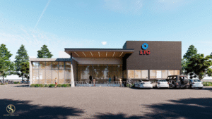 Phong cách hiện đại, hình khối mạnh mẽ: Các khối kiến trúc sử dụng màu sắc tương phản như xanh – trắng – xám – đồng ánh kim, tạo điểm nhấn thị giác và mang đến sự chuyên nghiệp, năng động.