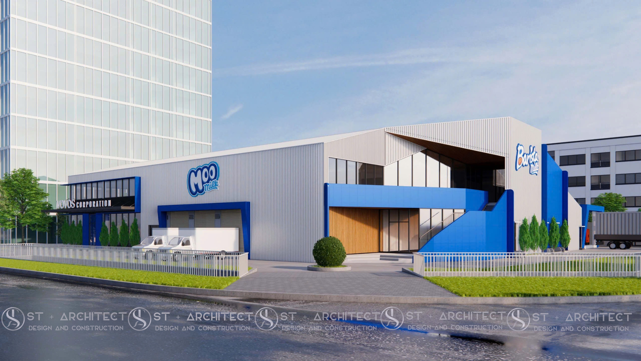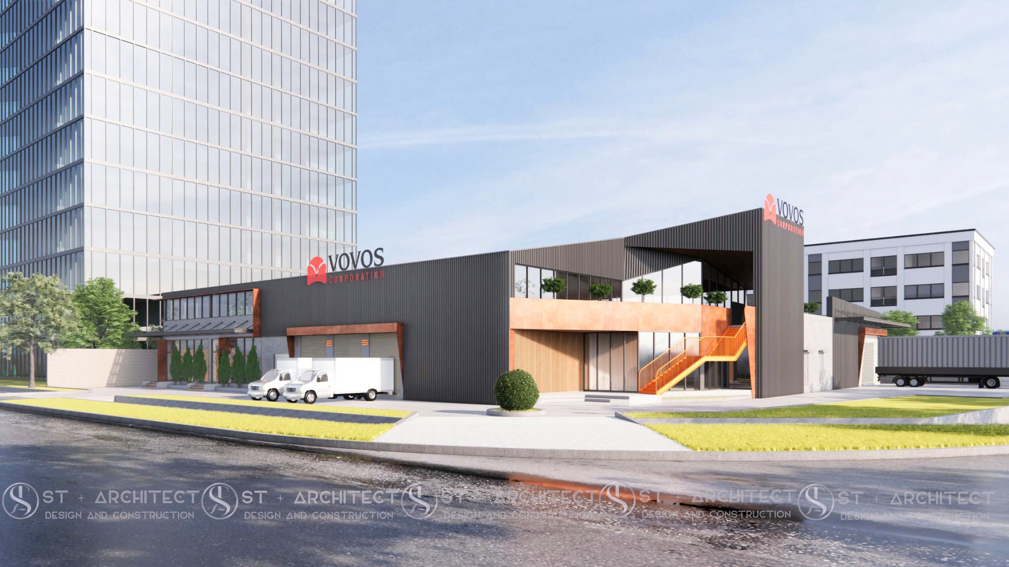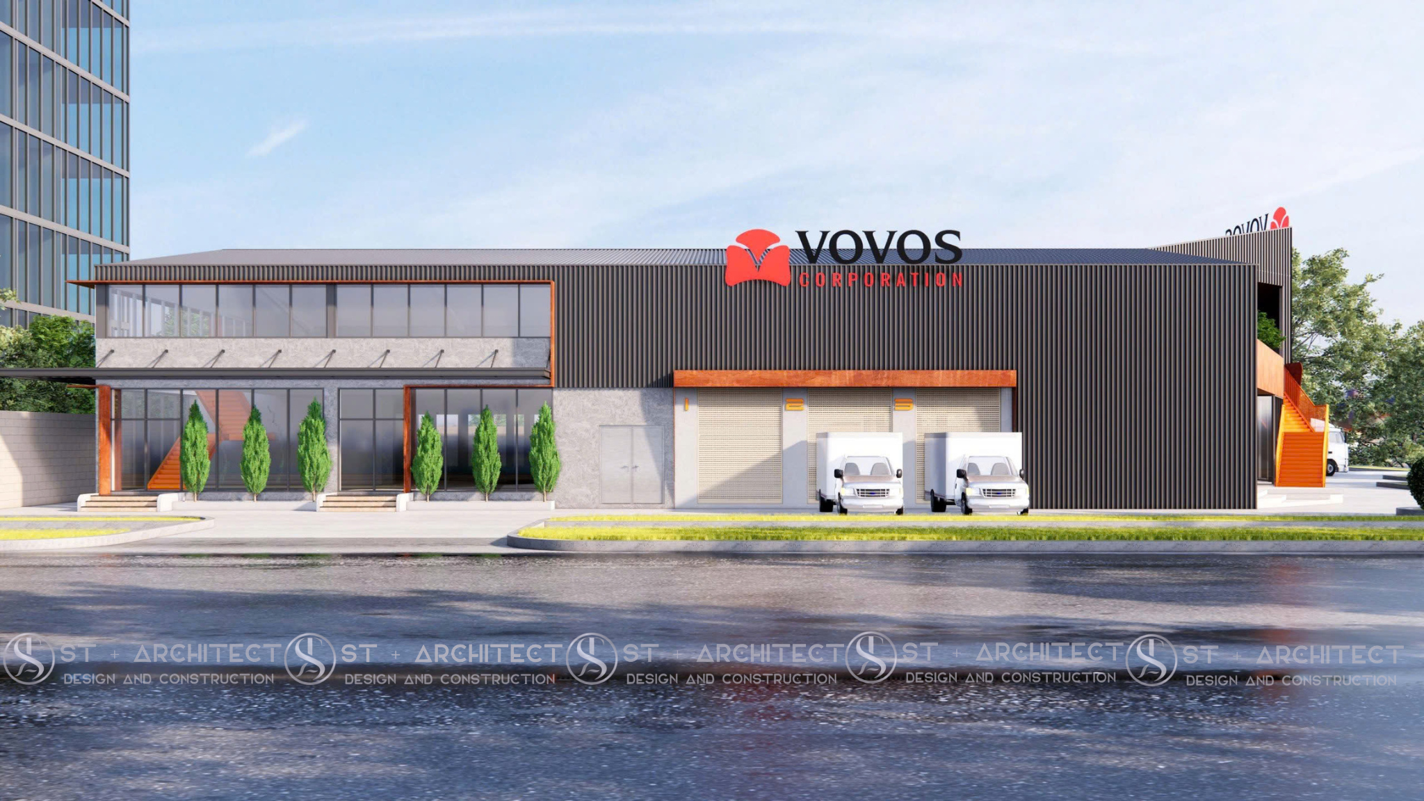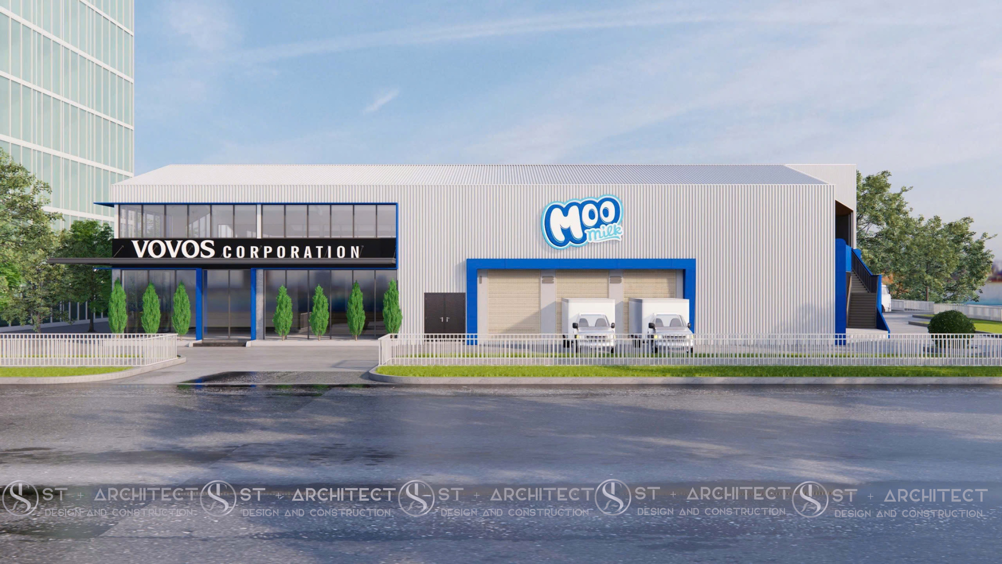 Trong lĩnh vực thiết kế kiến trúc công nghiệp, ST+Architect tự hào là đơn vị tư vấn và thiết kế cho dự án Nhà máy sữa Vovos – một công trình hiện đại tọa lạc tại khu chế xuất Tân Thuận, TP. Hồ Chí Minh. Dự án bao gồm chuỗi nhà xưởng, kho lạnh, khu văn phòng và hệ thống vận hành đạt tiêu chuẩn sản xuất ngành thực phẩm, đặc biệt là sữa.