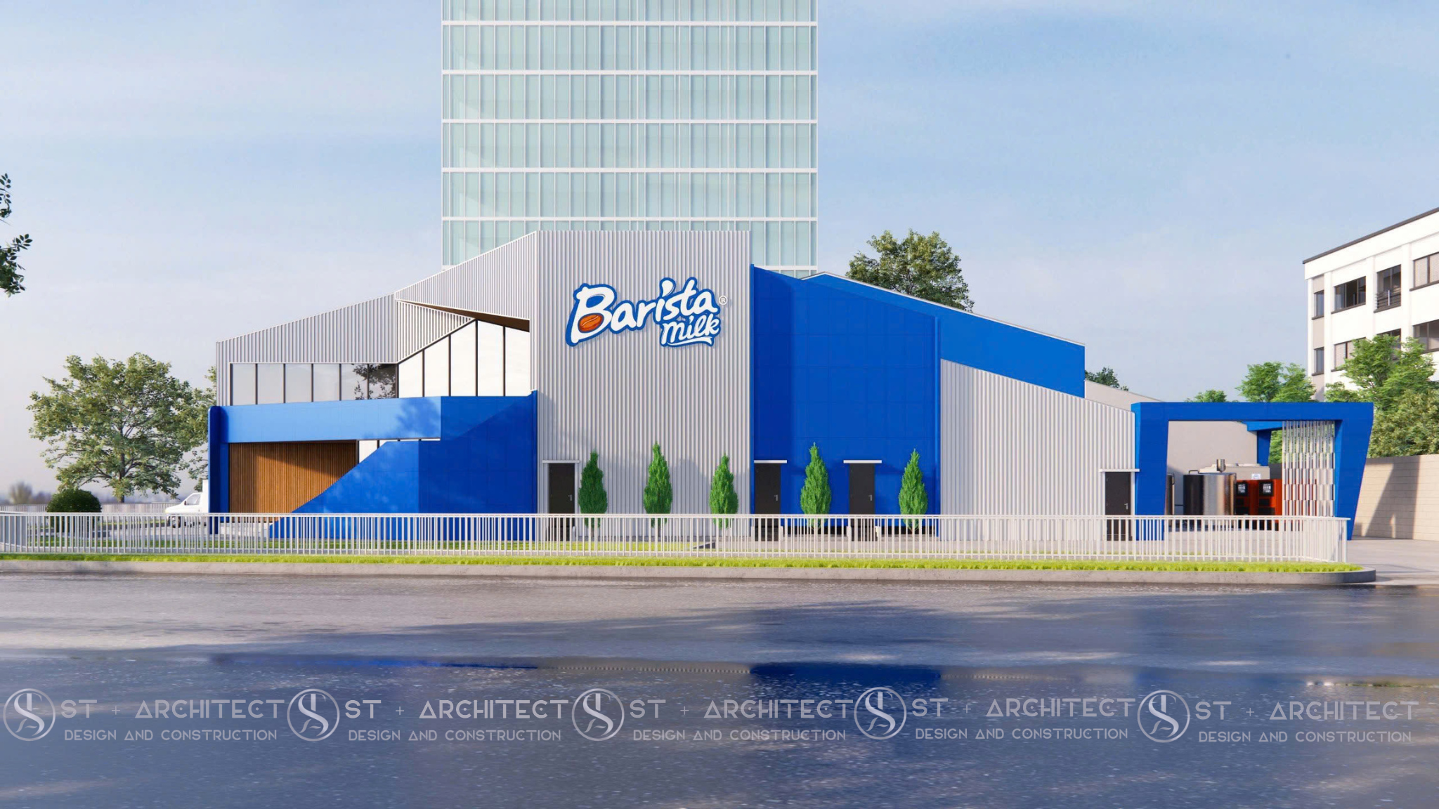 Mặt đứng nhận diện thương hiệu rõ ràng: Tên thương hiệu như Vovos Corporation, Moo Milk, Barista Milk được bố trí nổi bật trên mặt đứng, giúp tăng cường hình ảnh trong tâm trí khách hàng và đối tác.
