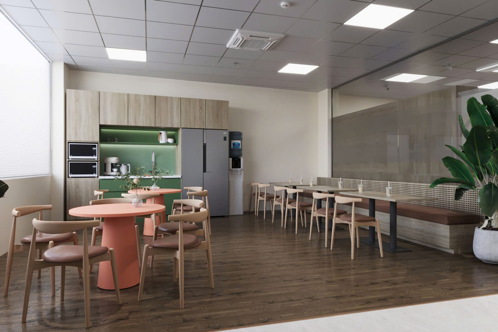 🔹 Khu vực thư giãn & pantry: Được thiết kế với tone màu nhẹ nhàng, kết hợp cây xanh và nội thất tiện nghi, mang lại sự thư giãn tối đa cho nhân viên