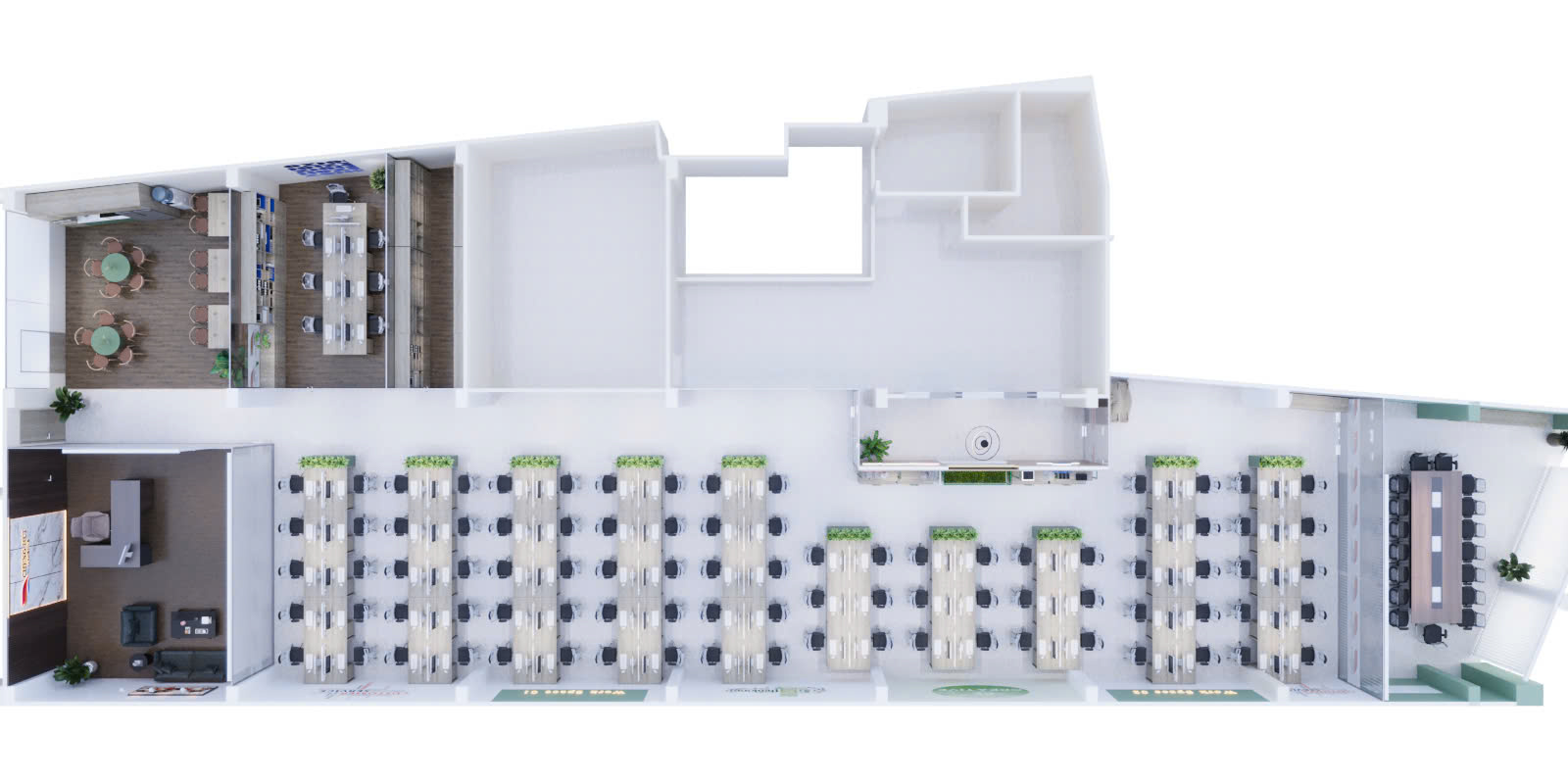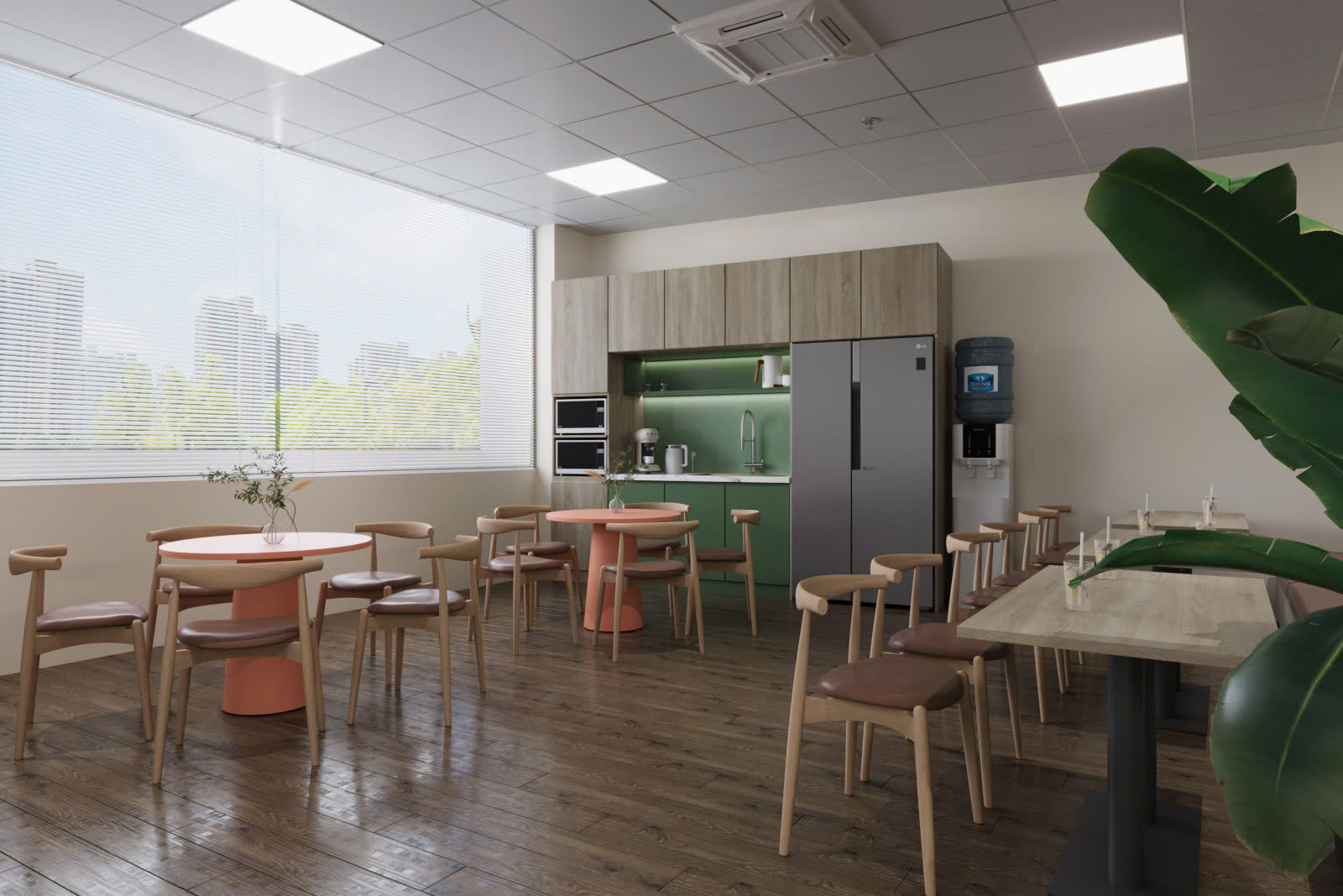 🔹 Khu vực thư giãn & pantry: Được thiết kế với tone màu nhẹ nhàng, kết hợp cây xanh và nội thất tiện nghi, mang lại sự thư giãn tối đa cho nhân viên